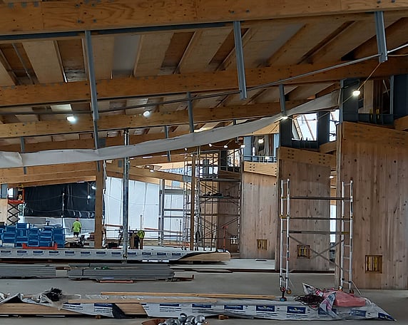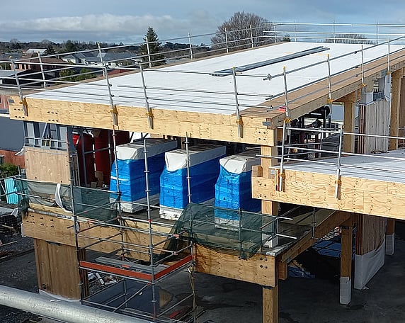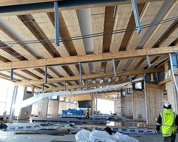 The importance level 3/4 design incorporates CLT post-tensioned rocking shear walls with Tectonus dissipation devices, LVL post and beam structure, and Potius™ Floor Box Beams, with a concrete topping, and Potius™ Roof Box Beam panels.