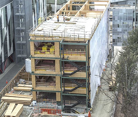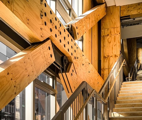 The Beatrice Tinsley Building is an innovative new building utilising the existing foundations of the building it replaces. The building provides teaching space and offices as part of the wider regional science and innovation centre on site. It is the first building in New Zealand that uses four stories of LVL moment frames (the timber post-tensioning was developed by the University of Canterbury) in one direction and cross braces in the other direction. The floors are Potius™ Double Tee panels with an acoustic ceiling.